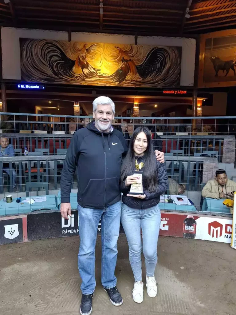 El reconocimiento al Mejor Gallo de la Fecha fue para el ejemplar del socio Juan Martín Dammert, representante del Círculo Gallístico del Perú, quien recibió el premio de manos de la señorita Lucero Galindo.